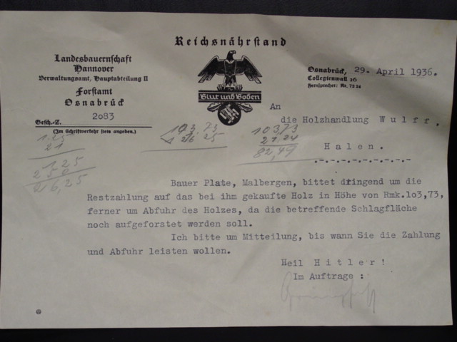 "Farmer plate, mark mountains, asks urgently for the Payment of balance on the wood located at hobe of Rsk.103, 73, bought with it, furthermore over drove off the wood, there the impactflat concerned still to be aufgeforstet is. I ask for report, biz when her payment and drove off to carry out want."