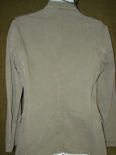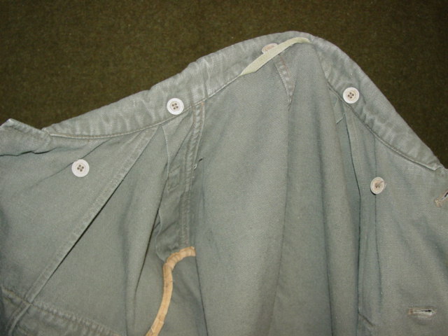 The inside collar has buttons made of cardboard. They were used to secure a hood. Shoulder boards are present
