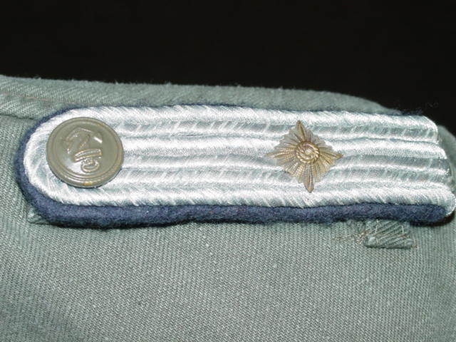 The shoulder board has a pip and the same type of button as the rest of the uniform. Very high quality construction.