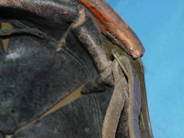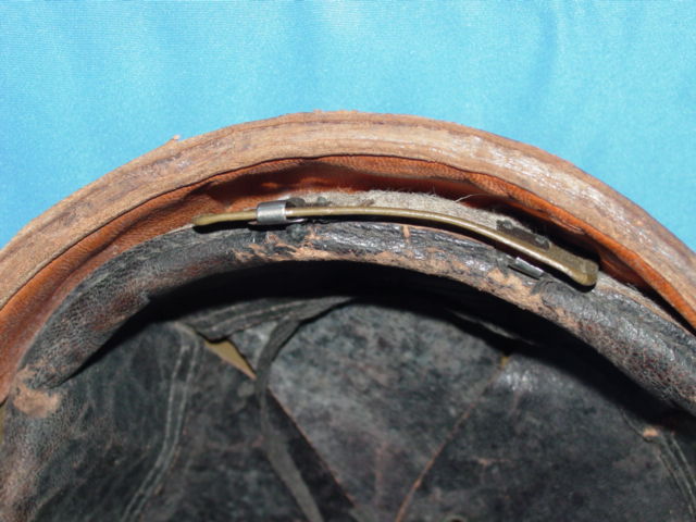 of a string. The leather is dyed black. A leather chin strap secures the helmet to the head