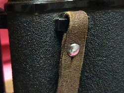 two rivets per side. The top of the case is secured by a spring loaded leather latch.