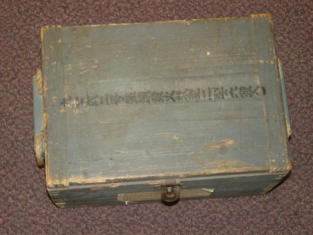 The following is a Japanese wooden ammo box. Of wooden construction. Painted gray. the top has a sereis of characters.