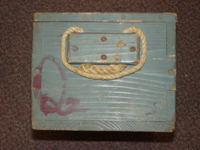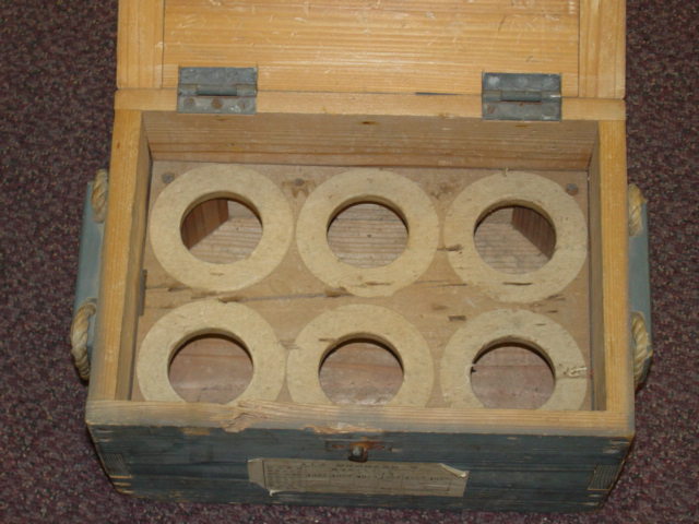 The inside of the box has a series of round holes located in a mid-wooden plate. More than likely used to house projectile