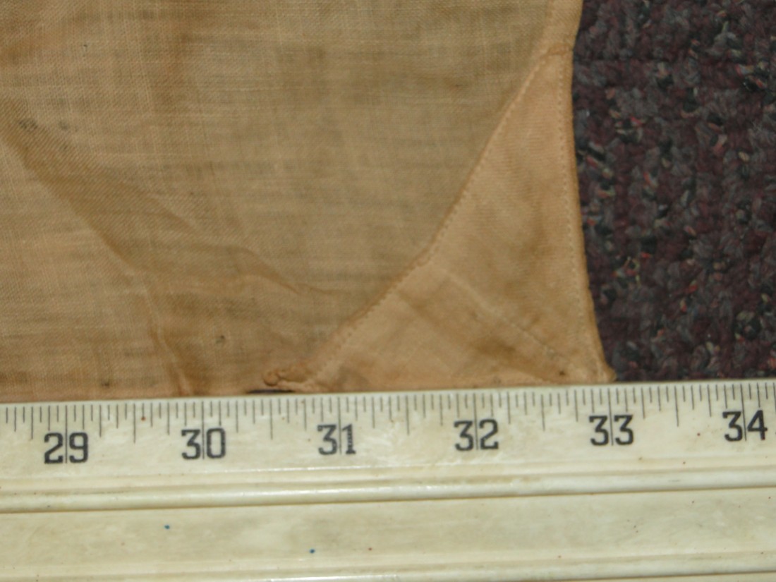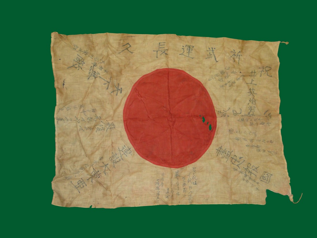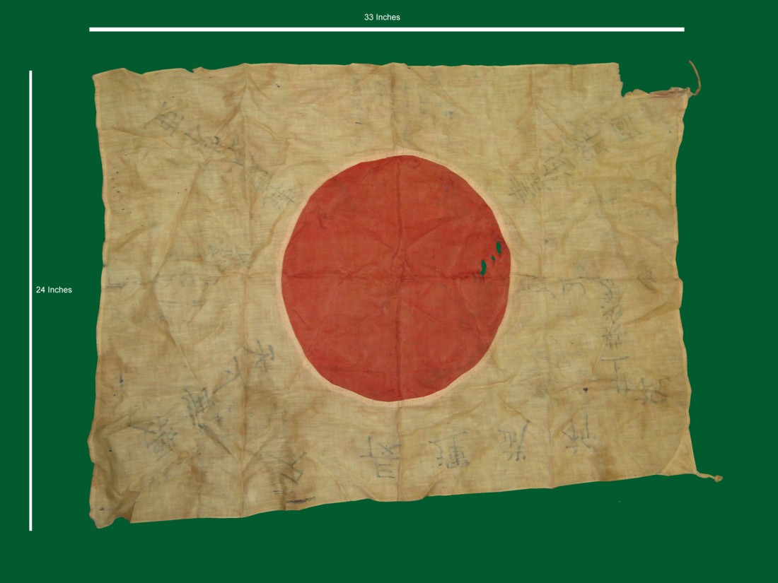 This flag is decorated with a scene of Mount Fuji and Chrysanthemum flowers. Decorations are applied to the center and corners of the flag. This was more than likely done by Japanese after the war for sale to the GI's. This was a common way in which to earn money.