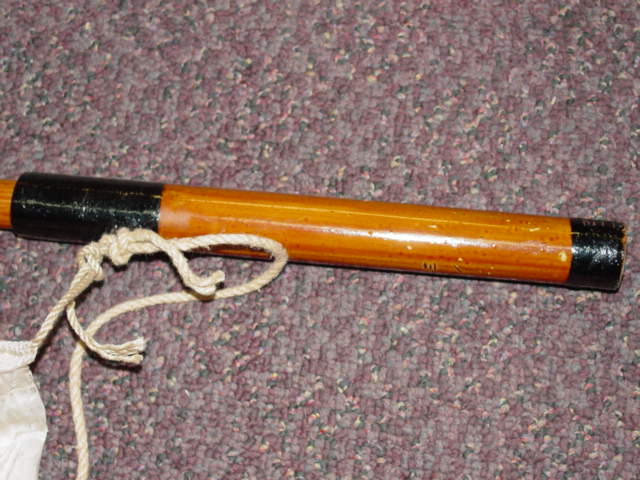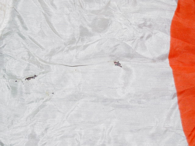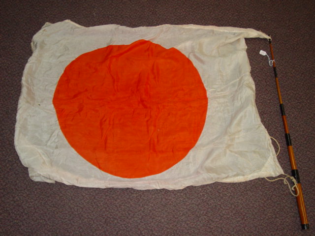 The following is a Japanese flag attached to a telescoping bamboo pole. This is the type of flags that people took to parades. Of silk construction. The center sports a large orange circle.