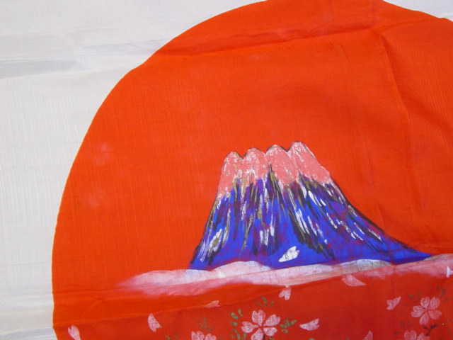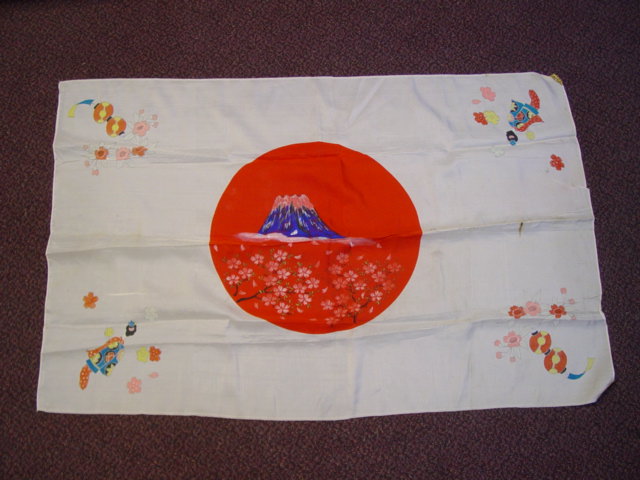 This flag is decorated with a scene of Mount Fuji and Chrysanthemum flowers. Decorations are applied to the center and corners of the flag. This was more than likely done by Japanese after the war for sale to the GI's. This was a common way in which to earn money.