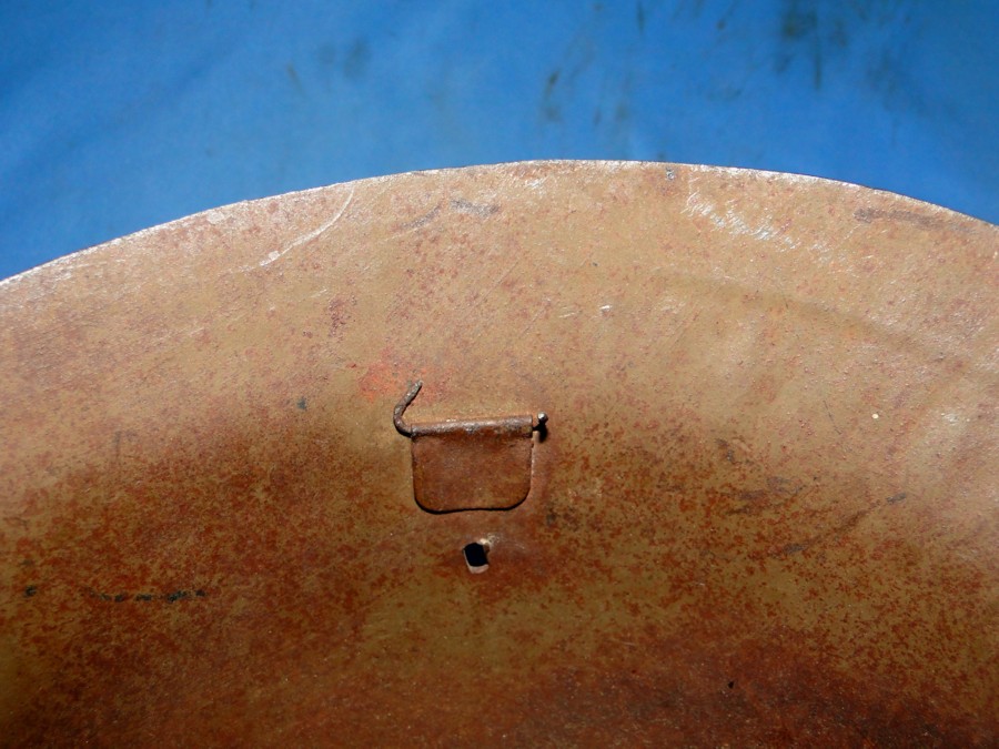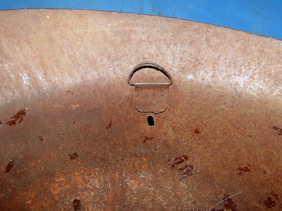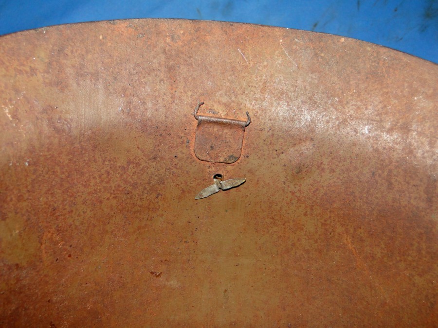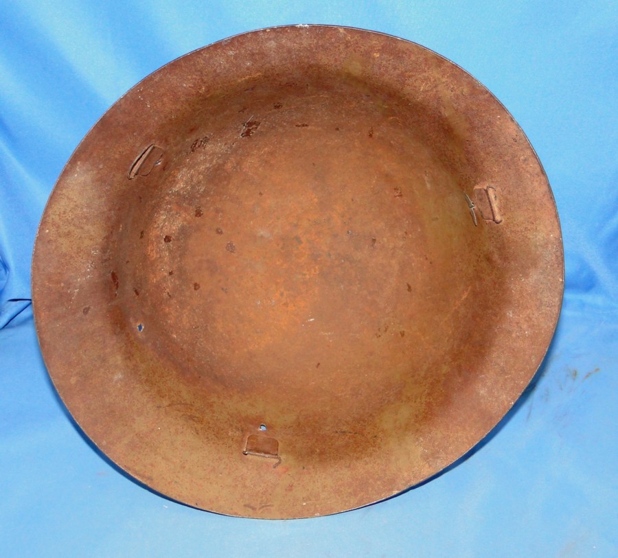 been applied to the front. No ventilation holes. The liner and chin strap are missing. The inside retains on of the