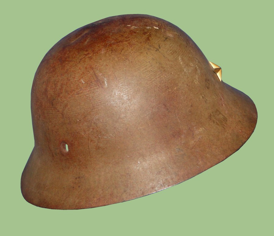 The design of the hat consists of a metal shell. Hand-painted where the brush strokes remain visible. A metal star has