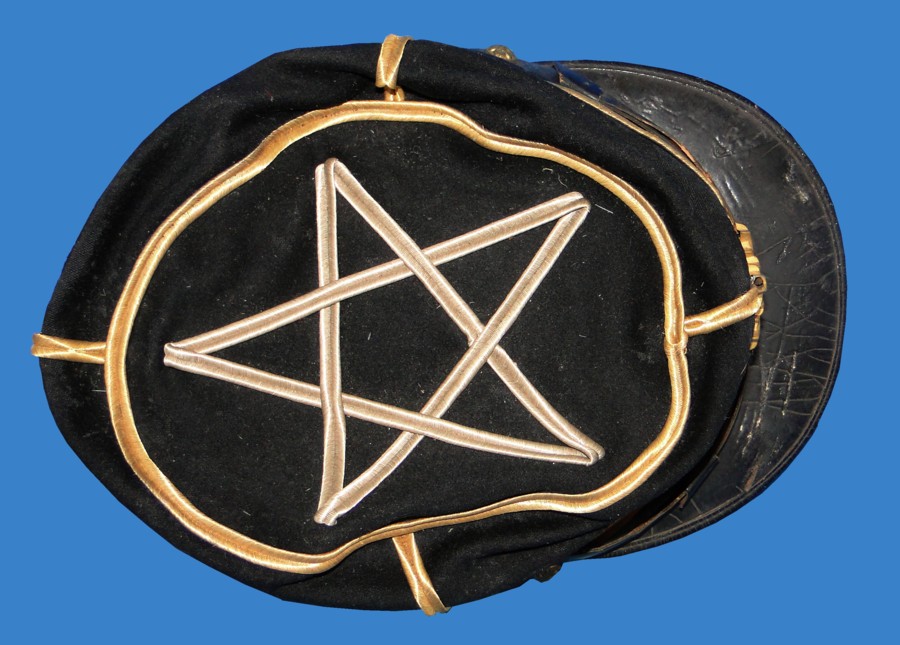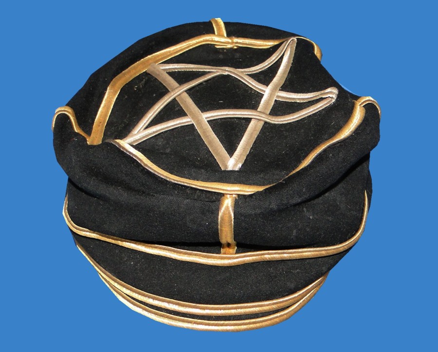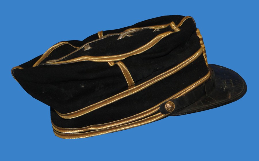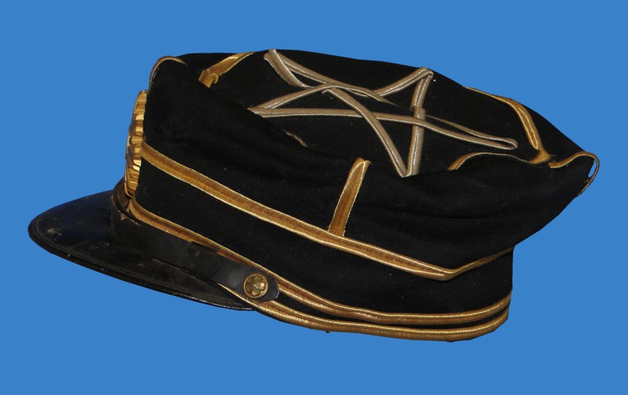 The design of the hat consists of all wool construction. Black or fark blue. The mid-section has a cross hatch pattern. Leather black visor. The front has a device attached to a leather pieces in turn attached to the hat. A Bullion embroidered wreath with an anchor in the center and a large Chysanthemum flower on top.