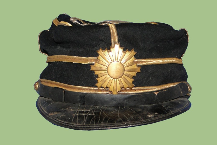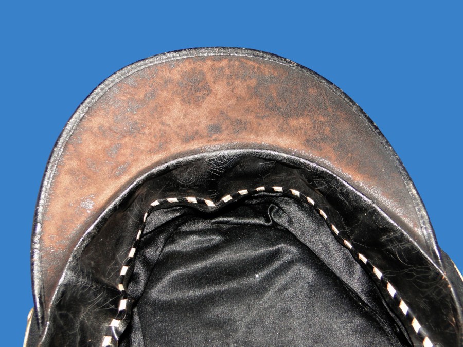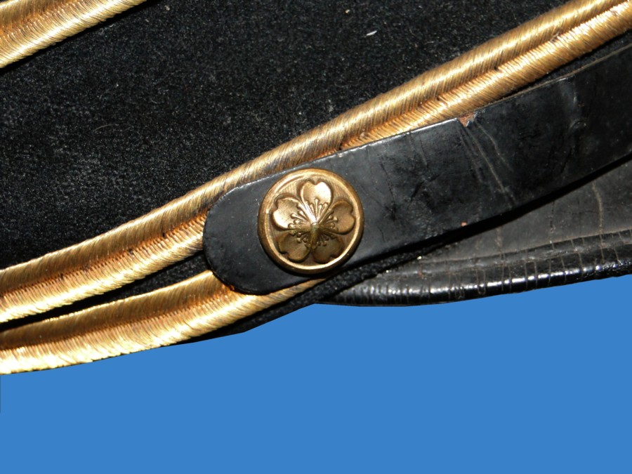 The hat has a black leather chin strap. A leather loop at each end allows for length adjustment, A gold button with the Chrysanthemum flower in the face secures the strap.