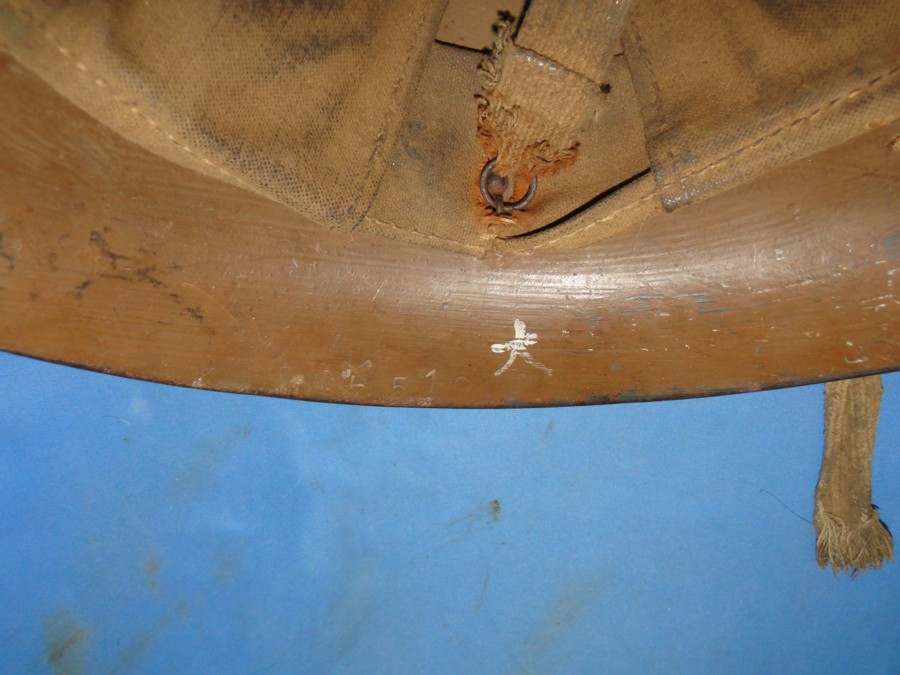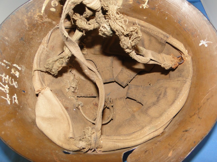 The design of the hat consists of a steel shell which shows a fair amount of battle field damage.