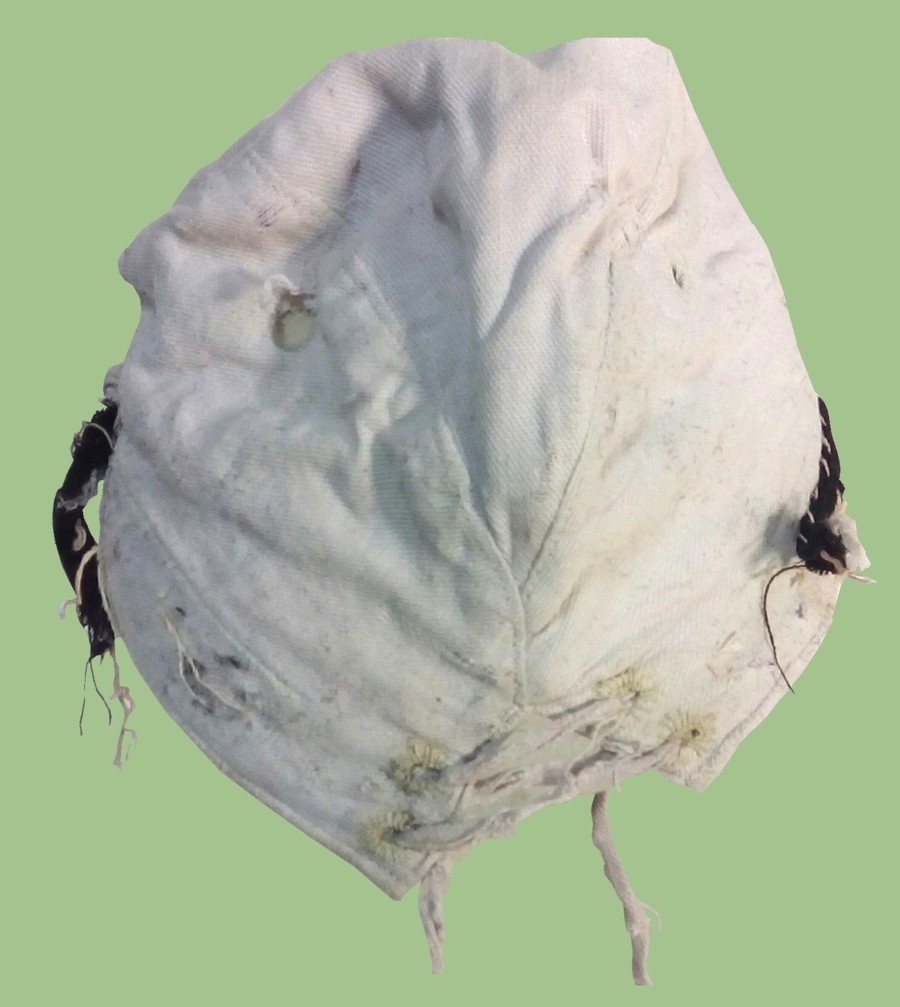 A drak blue pseudo chin strap is done in dark wool and is sewn to the sides. No markings are found on the