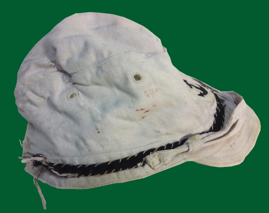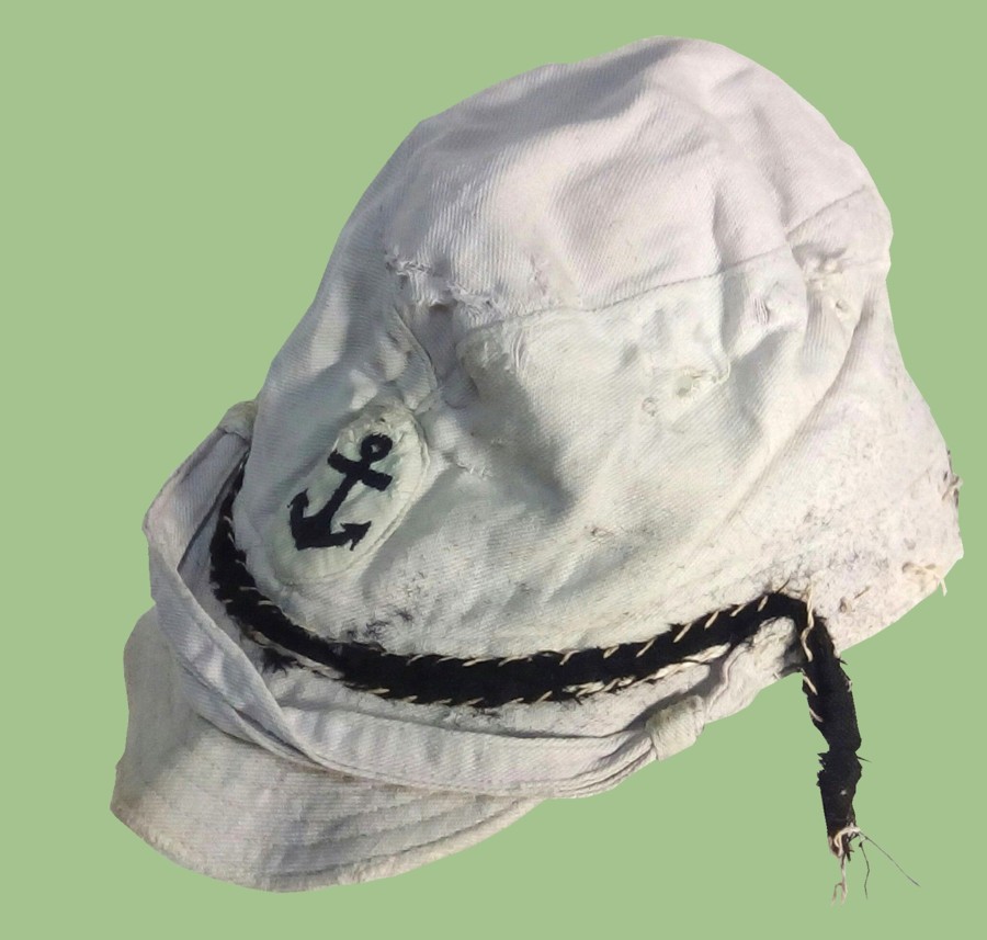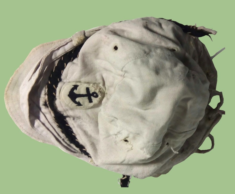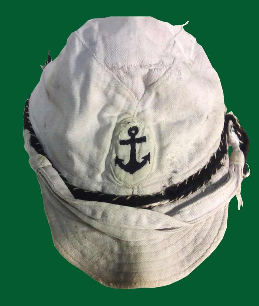 example featured here is in fair condition. Shows wear. An oval with an anchor emboidered is affixed