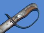 Wooden handle with a metal checkered back. Battlefield example with the blade showing pitting towards the tip.