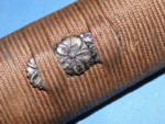 The menuki is the shape of a leaf. The blade shows some rusting.