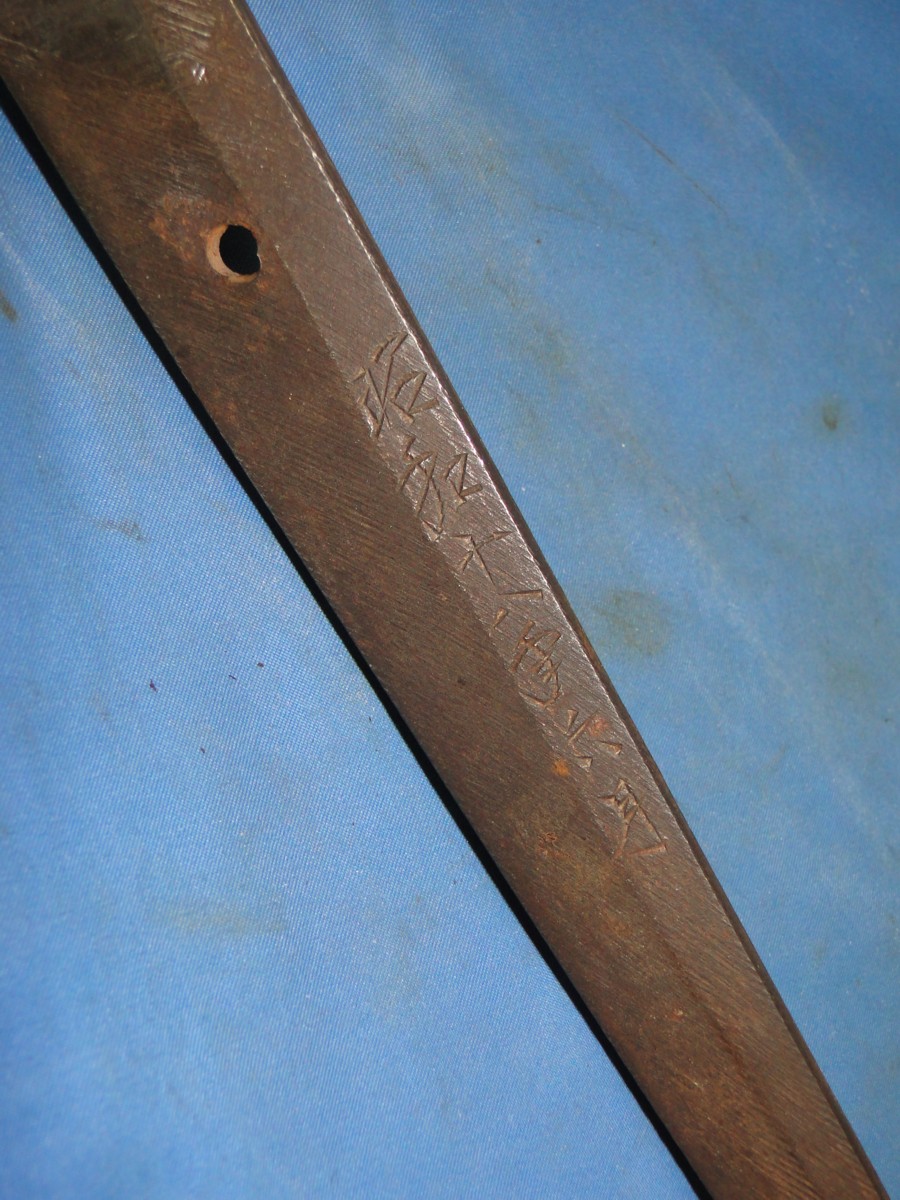 The handle of the sword has been removed in the pictures below. The signature of the maker is found on one side. The date has been carved on the