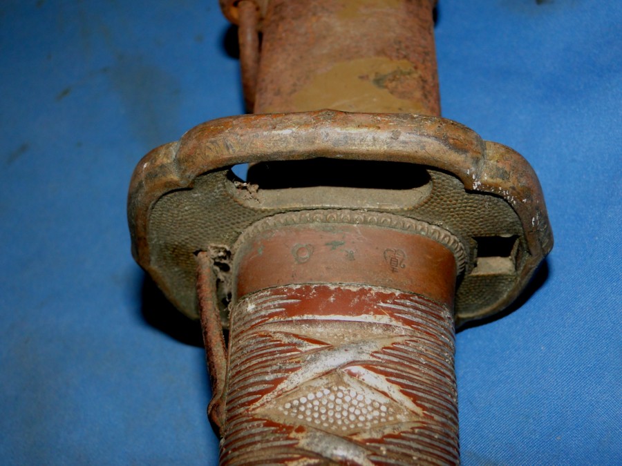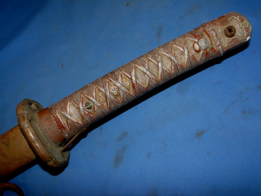 the paint has worn off the handle. Very nice and deep pebbling is present on the surface of the tsuba.