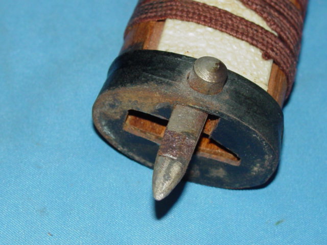 The pommel shows a lightly pebbled metal cap. The hole in the wood was never finished. Shortcuts in the production