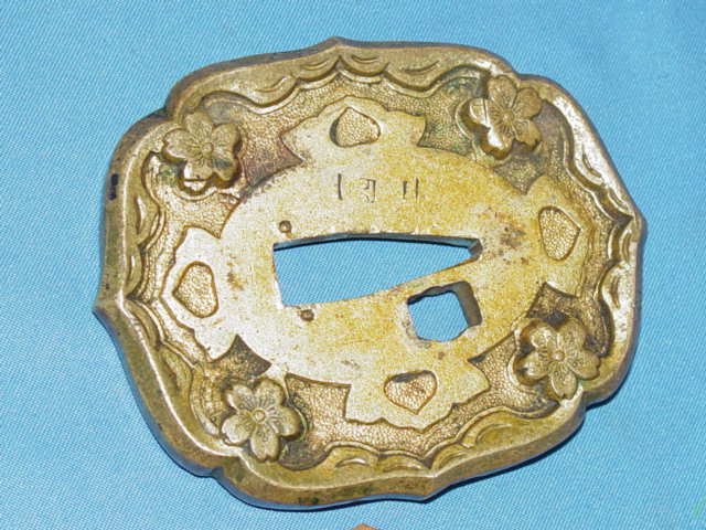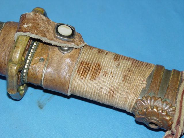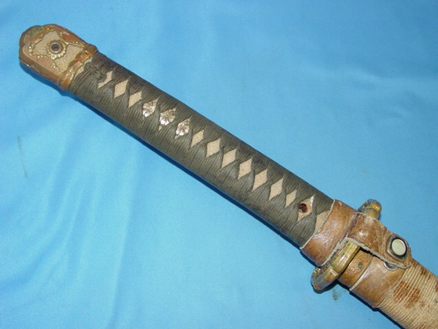 World War Two type. The handle is wrapped in a dark green cloth. A set of Menuki are found on each side of the