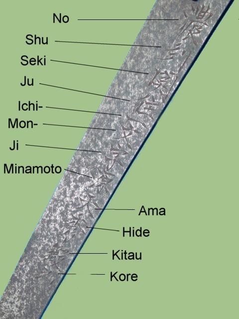 nicely done with deep markings. A translation is provided and indicates the sword was made by master Ama-Hide.