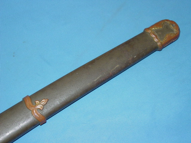 The scabbard has a metal shell over a wooden insert. Four fittings are found spread around the main body. The tip