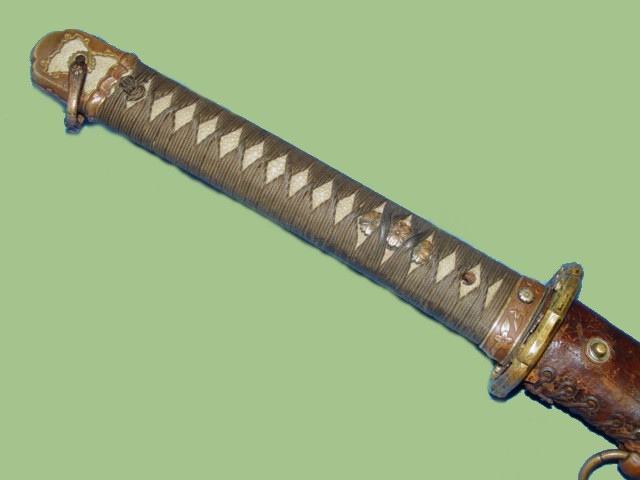This is a Japanese WWII Samurai Katana sword. The sword is dressed in the Japanese Imperial Army attire.