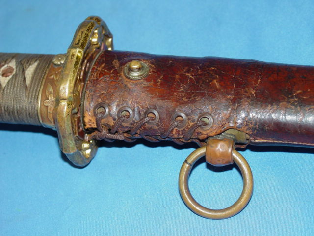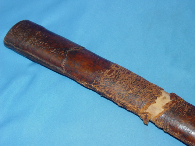 The scabbard is of wooden construction and is covered with dark brown leather. The throst section of the cover