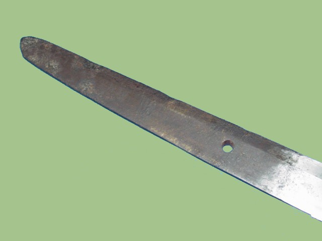 The tang is very rough in construction. This indicates an older blade. No signatures are present. A single hole