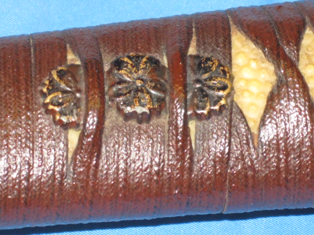 The Menuki is secured to the handle via the use of cloth wrapping. Its design consists of the three flower pattern.