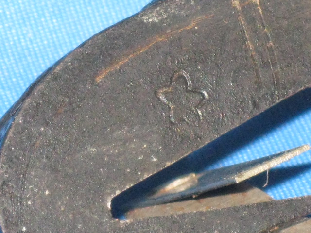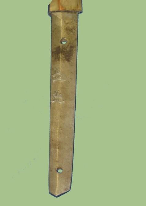 The tang has two holes. The end section shows two angled components. A two character signature is found. No other