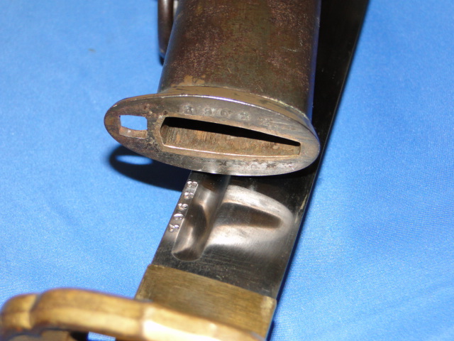 The base of the handle has a metal band with arsenal markings stamped on it. The side of the handle has a spring