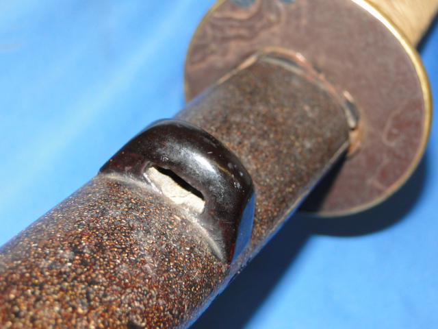 The following pictures show the manner in which the handle was wrapped. very tight pattern which hides the Menuki.