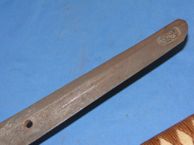 The pommel has a metal cap that has the Chrysanthemum flower on the sides and top. Light pebbling serves as background.