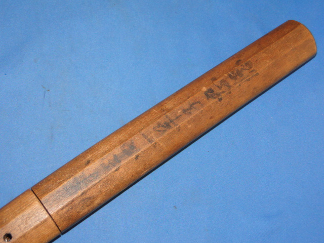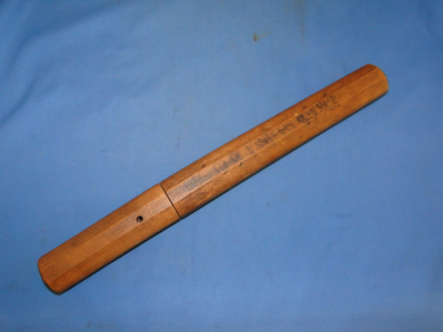 is encased in a wooden container. Japanese characters are written on the scabbard. the handle has a single hole