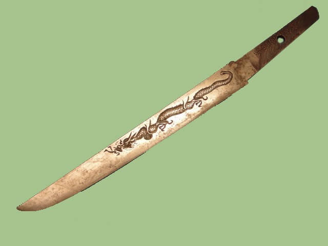 The blade is beautifully engraved with a dragon. The image is executed by striking single lines one at a time.