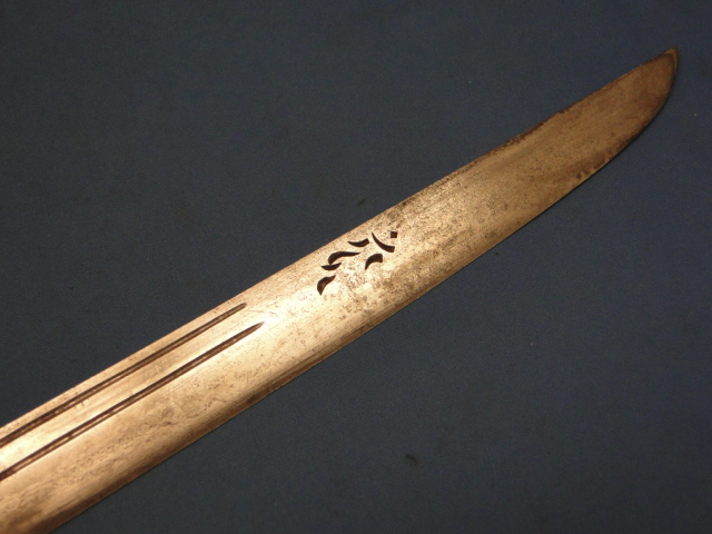 The other side of the blade has additional characters near the tip. Two parallel lines have also been carved.
