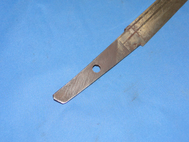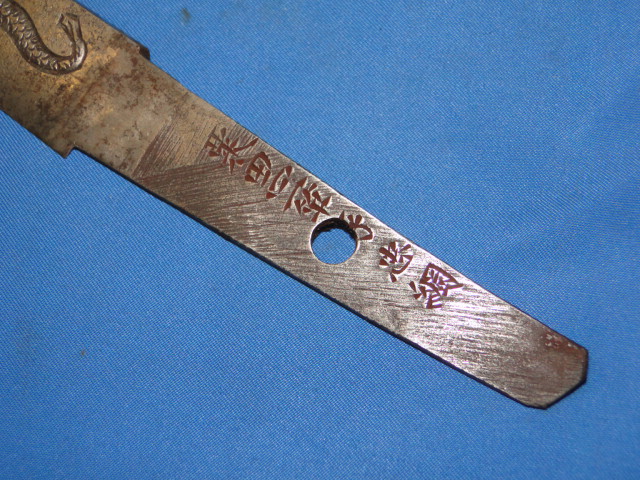 The tang is nicely signed with seven characters. The hole was drilled near the center of the tang. Angled file