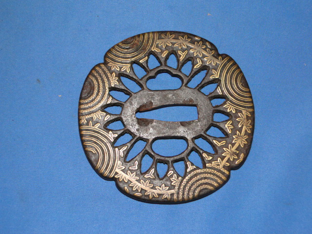 The Tsuba has a four section design. There are a series of arrow shaped cuts around the perimeted. A pattern of circles