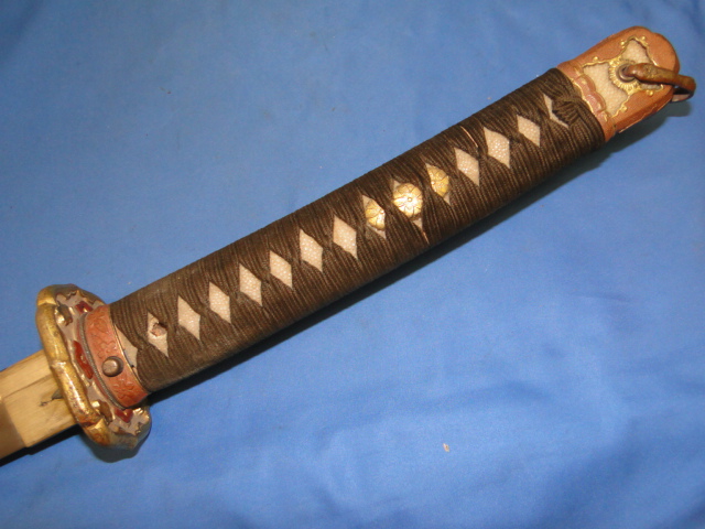 This is a Japanese Imperial Army sword. As issued to officers during WWII. The handle is wrapped in the traditional