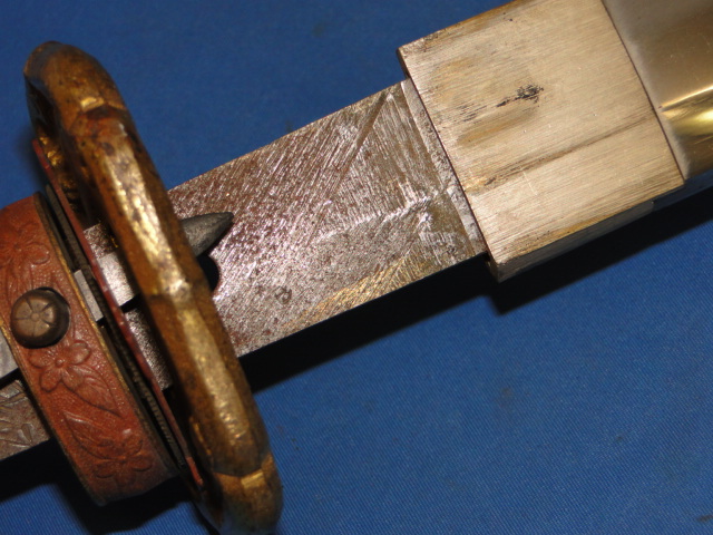 When the handle is removed traces of the filings are visible in the form of lines at an angle. The Habaki is of standard