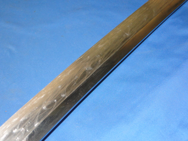 The blade shows swirl patterns most likely created by a buff wheel. In addition, oil has been added to the blade and it dried up.
