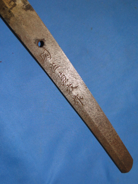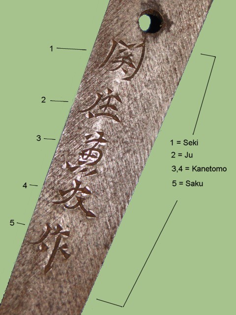 The other side of the tang is marked with additional information which contains the name of the swordsmith, which was Kanemoto.