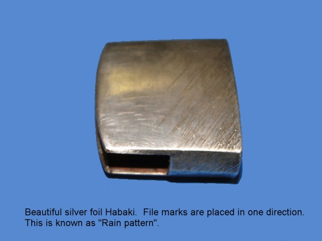 The sword comes with a beautiful silver foil Habaki. The sides show file marks known as "rain pattern". This piece was