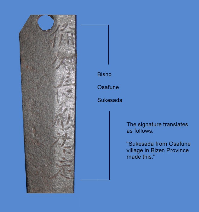 The tang is signed "Bishu Osafune Sukesada", this translates to "Sukesada from Osafune Village in Bizen province made this". The tang measures approximately 5 1/4 inches in length.