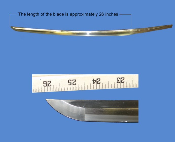 heavier than normal because the blade is thicker than what you find in a WWII blade. The blade measures 25 3/4 inches. The edge is in good condition. It does not have any nicks or rust. The thickness is close to 1/2 inch. A strike from this sword would be devastating.