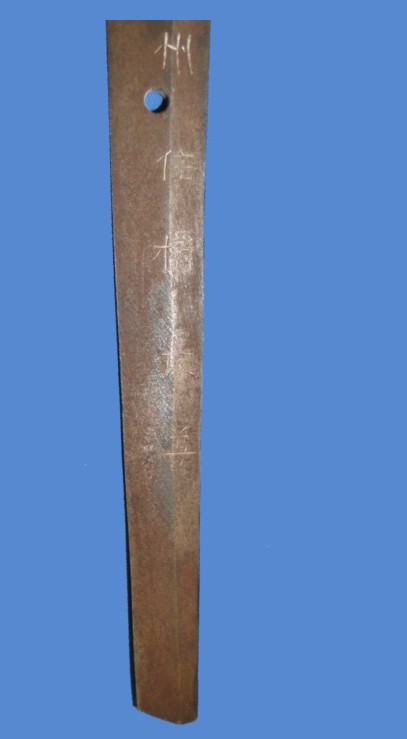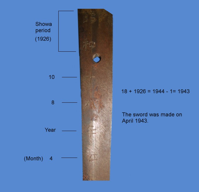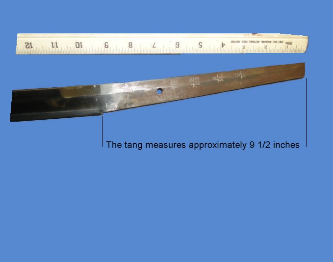 The tang is signed and dated. It measures around 9 1/2 inches. The sword was made on April 1943 by swordsmith Nagayoshi. The signature is a little shallow. It is possible that the sword was actually signed by one of Nagayoshi's students. This was not an uncommon practice in the history of the Samurai sword. It is clear by the quality of the blade that a master made it. This is a hand forged Gendaito and retains alot of the original polish.