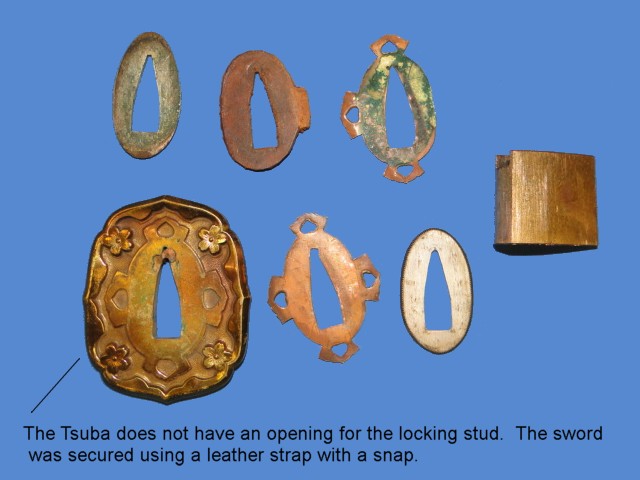 The handle is firmly wrapped. The standard WWII Menuki are present. The Tsuba us also of the WWII period. Note that it does not have the opening for the locking mechanism to go through. That is because a leather strap was used to secure the sword to the scabard. This strap is missing.