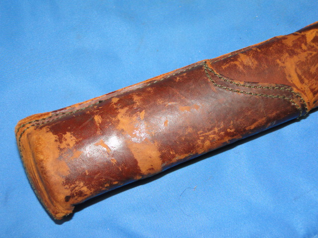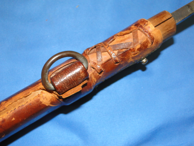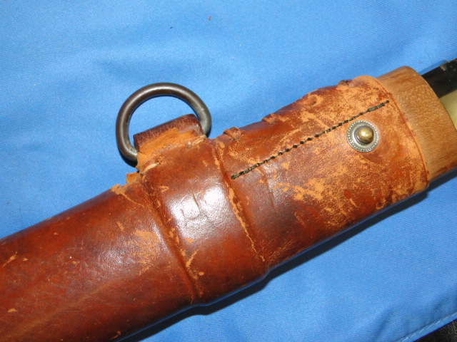 The scabbard has a brown leather cover. One side of the neck area has leather ties to close it firmly. A single suspension ring is found.