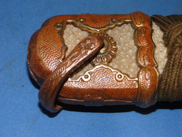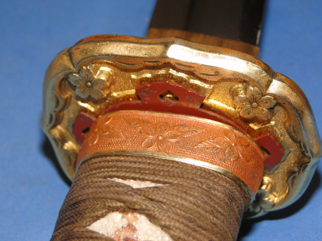 with the vertical flowers on both sides. It has the traditional lanyard loop. A three flower Menuki is placed