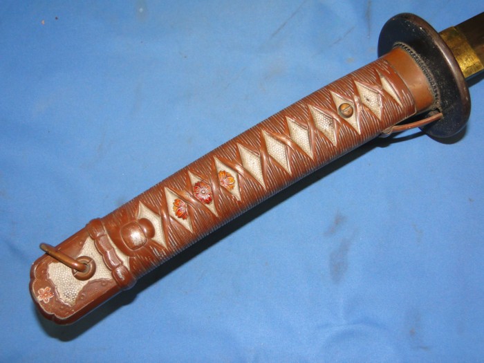 This is a Japanese Samurai sword. NCO type issued during WWII. The entire sword was machine made. Complete